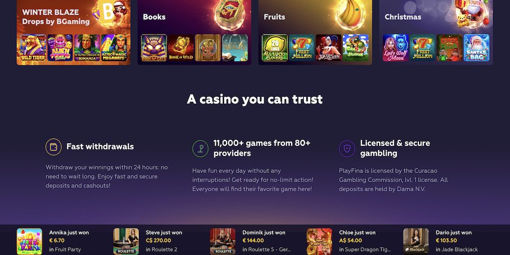 More than 11,000 slots, all varieties of blackjack, dozens of roulette games, craps, video poker, and other games are available to you at Playfina casino online In-Depth Playfina Reviews - Get an Unbiased Analysis of the Most Sought-After Games and Apps! Play the Best Online Casino Games at Playfina ✓ Try Slots, Blackjack, Roulette, Craps and Video Poker with Huge Bonuses. Playfina Casino How to Start Up to 1000€ + 200 FS + Secret Bonus... Playfina Casino - Bonus Codes – 50 Free Spins!
